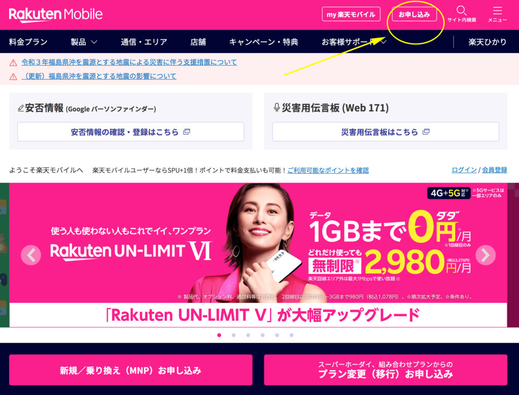 もしまだ楽天会員になっていない場合はこちらから事前登録しておくとスムースにSIM申し込みができます。
