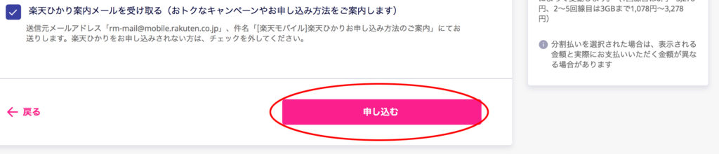 煩わしければ案内メールのチェックは外して大丈夫です。申し込むをクリック