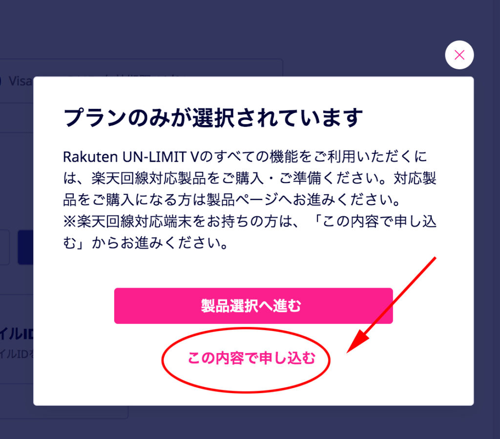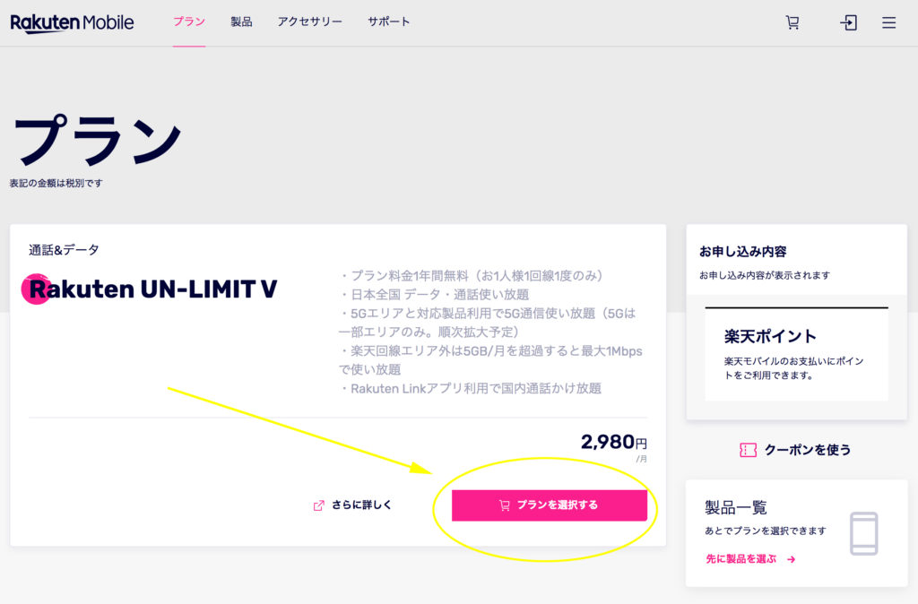 楽天モバイル側の表示が頻繁に変更されているので下画像と異なる場合があるかもしれませんが、プランは一つしかありません(選択の余地なし)ので簡単です。