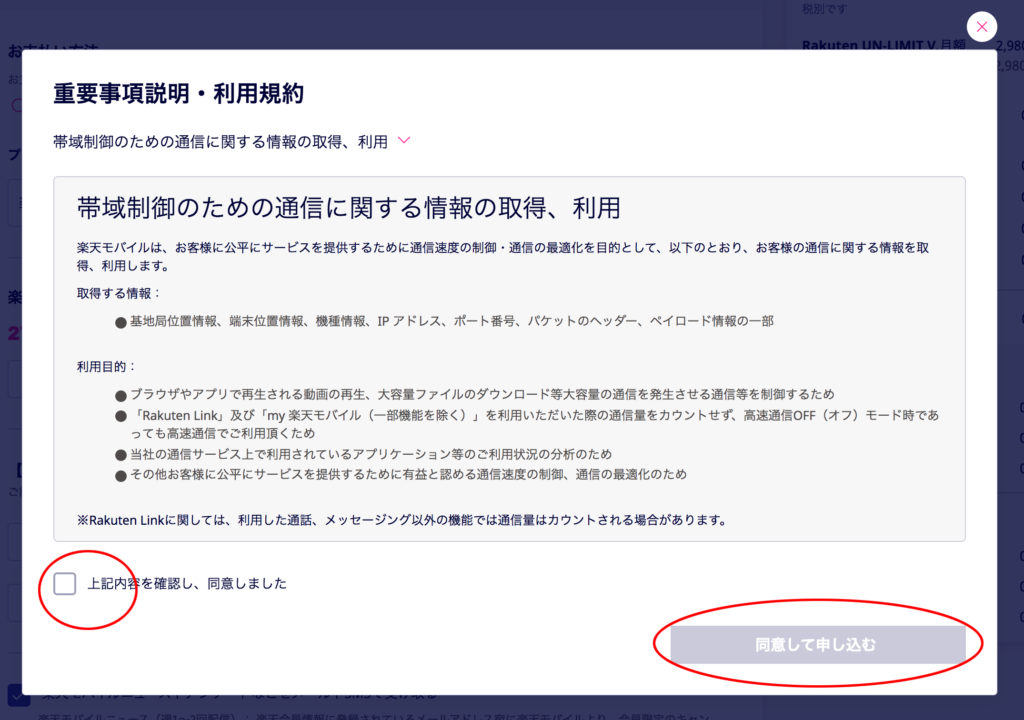 規約を読んで納得したらチェックを入れて同意して申し込むボタンをクリック