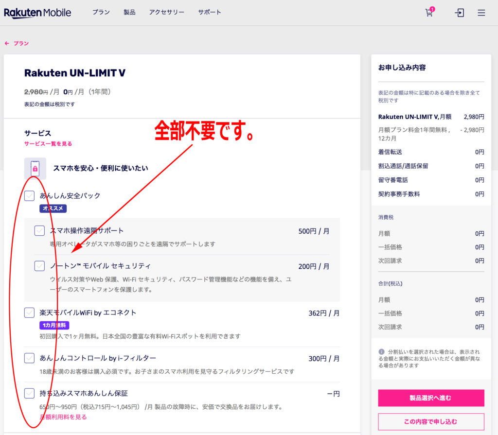 この内容で申し込むをクリック(ついでにスマホを買いたい人は製品選択へ進むへどうぞ)