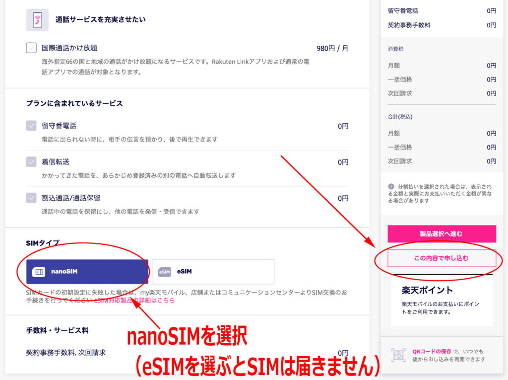 必ず【nanoSIM】を選択して【この内容で申し込む】をクリック