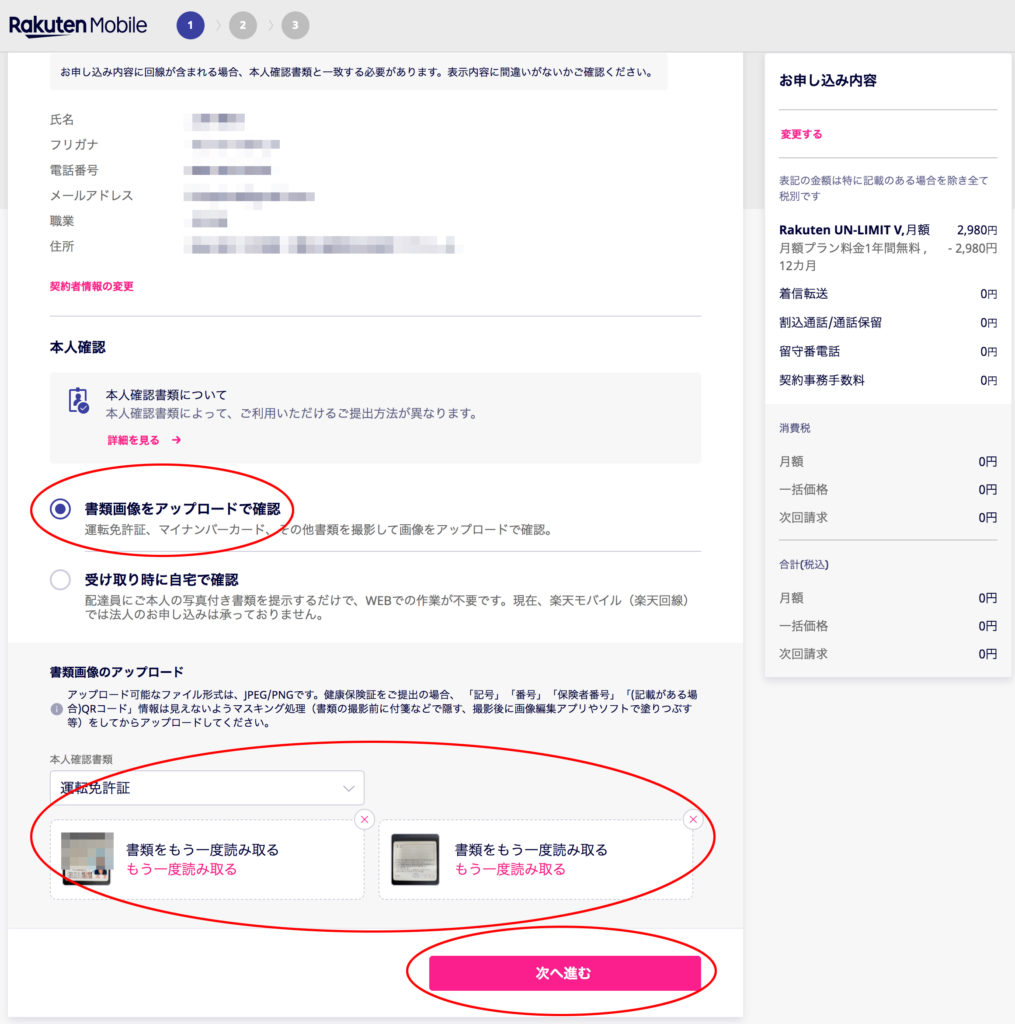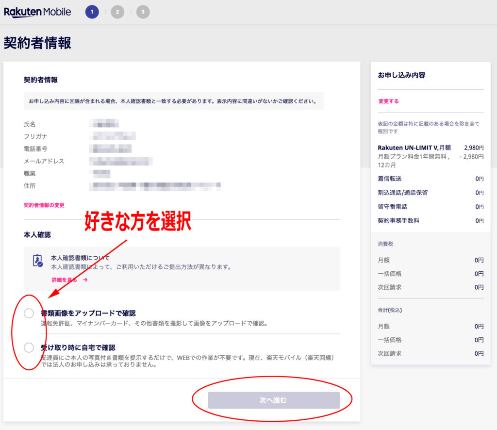 本人確認書類をアップロードする場合はここでアップロードしてから次へ進むをクリック